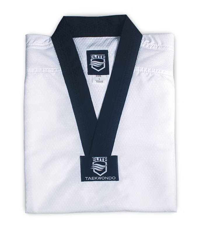 Uniforme de Taekwondo con cuello negro en tela «ULTRALIGHT» para mejor movilidad y rápido secado. Versión original. Oferta hasta agotar las existencias